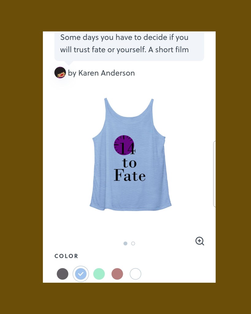 This month the shirt is dedicated to my short film 14 to Fate. It is an Afro futuristic piece. The theme is we all have choices to make but will they be good ones.